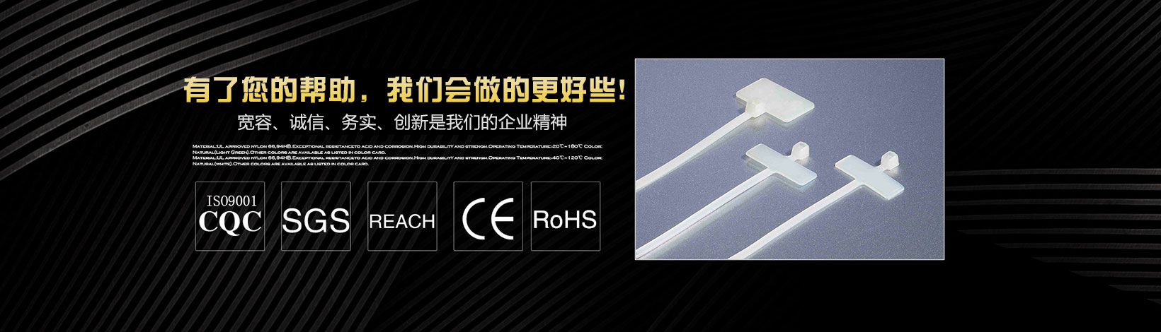 本公司專業生產銷售尼龍扎帶、特殊型扎帶、吸盤(自粘式定位片)、塑料膨脹管、尼龍壓線帽、電纜防水接頭、鋼釘線卡、R型線夾、飛機型線夾、瓷磚定位十字架、固定座、纏繞管、異型管、齒型管、號碼管、熱縮管、黃臘管、扎絲、鋼管蓋等系列產品。 我們擁有先進的檢測設備和雄厚的技術力量,并不斷優化生產流程,規范生產環節,加強完善質量控制系統,以優異的品質深得海內外客戶的一致好評。